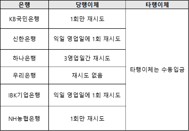 - IBK기업은행 : 익일 영업일 1회 재시도