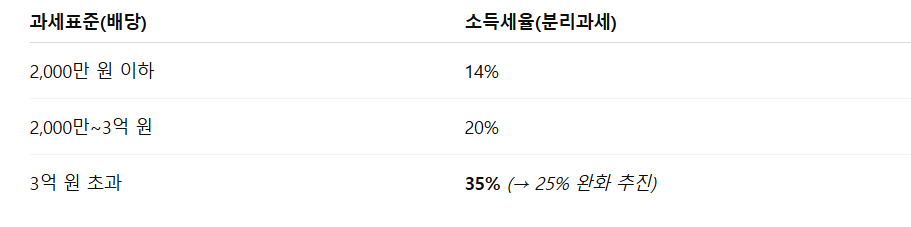 정부와 여당이 배당소득의 '분리과세' 최고세율을 35%에서 25%로 낮추는 방안에 공감대를 형성했다. 구체적인 수치는 향후 국회에서 최종 결정이 될 예정이지만, 정부와 여당이 공감대를 형성한 만큼 추진이 빠를 것으로 예상된다. 이와 같은 방안은 25년 7월 발표된 세제개편안에 담긴 내용에 담긴 특별 규정이다.