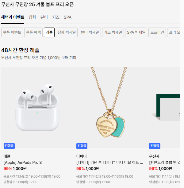 : 래플 이벤트 무신사 무진장 프리 오픈 기념 48시간 한정 래플을 통해 다양한 상품을 당첨 시 1,000원 구매 가능