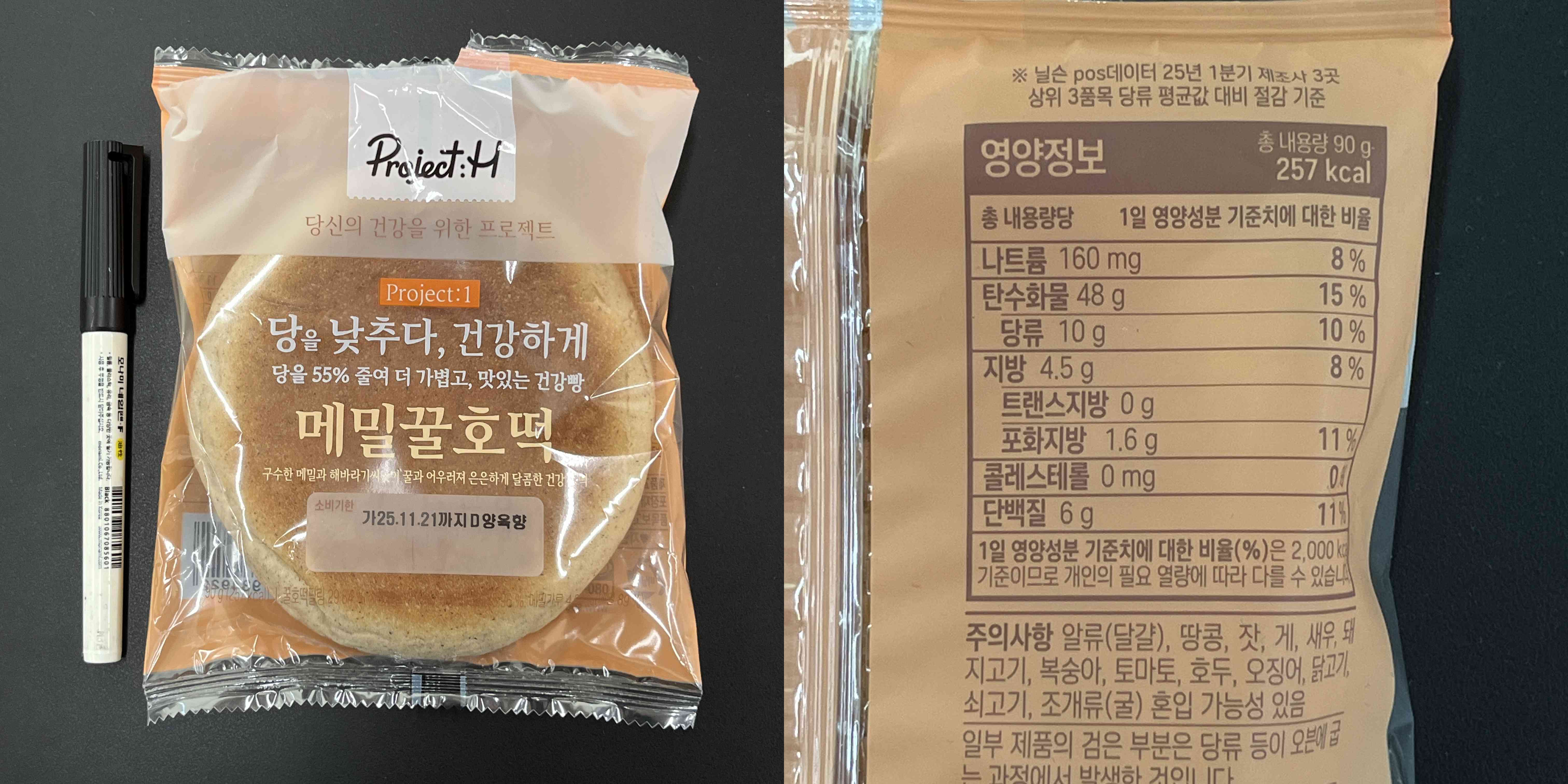 건강이 꾸준한 트렌드로 나오면서 편의점 빵들도 당류를 줄인 제품들이 나오고 있다. 그중 하나인 프로젝트H의 메밀꿀호떡. 당류도 주였고 메밀로 만들어서 건강빵이라고 한다. 구수한 메밀과 해바라기 씨앗이 꿀과 어울리게 만들었다고 한다.