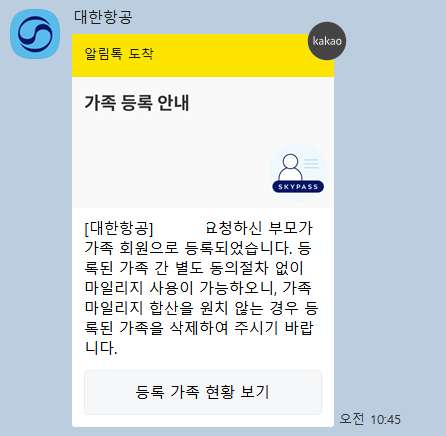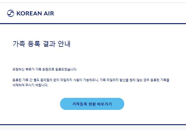 나의 경우는 금요일 오전에 신청하고, 월요일 오전에 처리가 완료됐으며 카카오톡이나 메일로도 알림이 온다. 설명도 잘돼있고 절차도 너무 간단해서 모두들 다 쉽게 할 수 있을 것 같다. 이후에 가족 마일리지 합산을 원하지 않다면 등록된 가족을 삭제하면 된다.