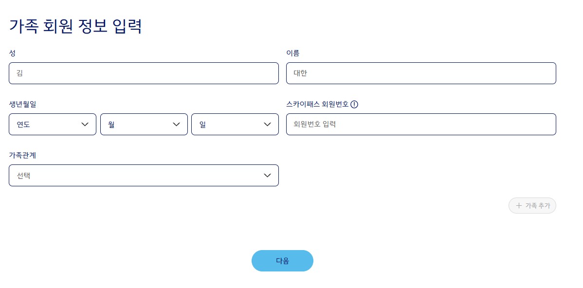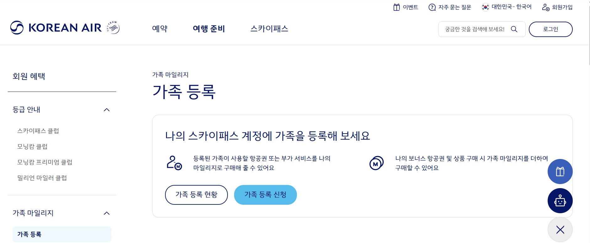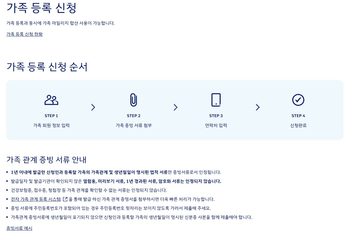 대한항공 가족등록제도는 대한항공 공식 홈페이지에 들어가서 스카이패스 > 회원혜택 > 가족마일리지를 눌러서 절차대로 진행하면 된다. 필요한 서류는 가족회원정보의 생년월일 및 스카이패스 회원번호와 1년 이내에 발급한 가족관계증명서가 필요하다.