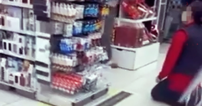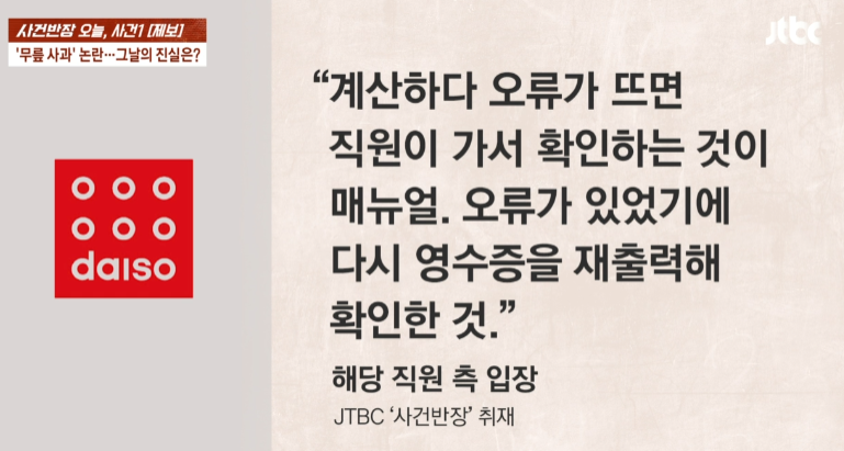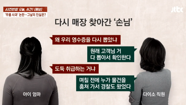 그 모습을 본 40대 여성은 왜 영수증을 다시 뽑아 확인하냐는 말에 며칠 전에 절도 사건이 있어 경찰도 다녀가서 재확인을 하였다라고 말 하였다. 이때 들고 있던 밀대 걸레를 던지더니 순식간에 무릎을 꿇고 죄송하다 고객님이라고 연신 말을 했다고 한다.
