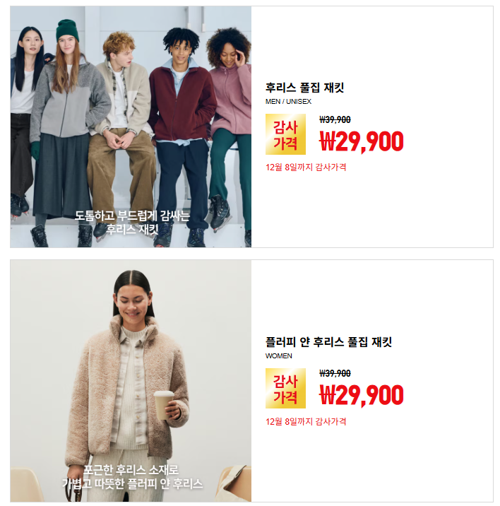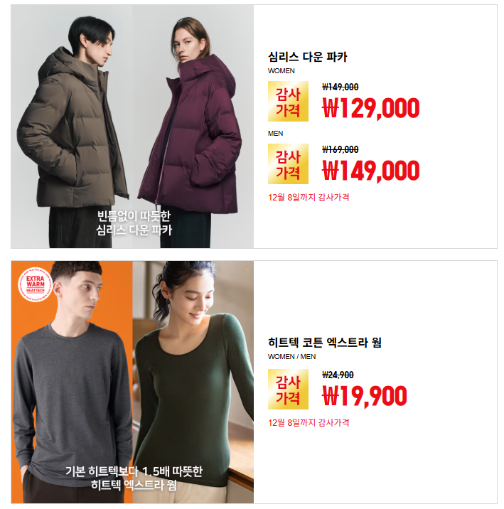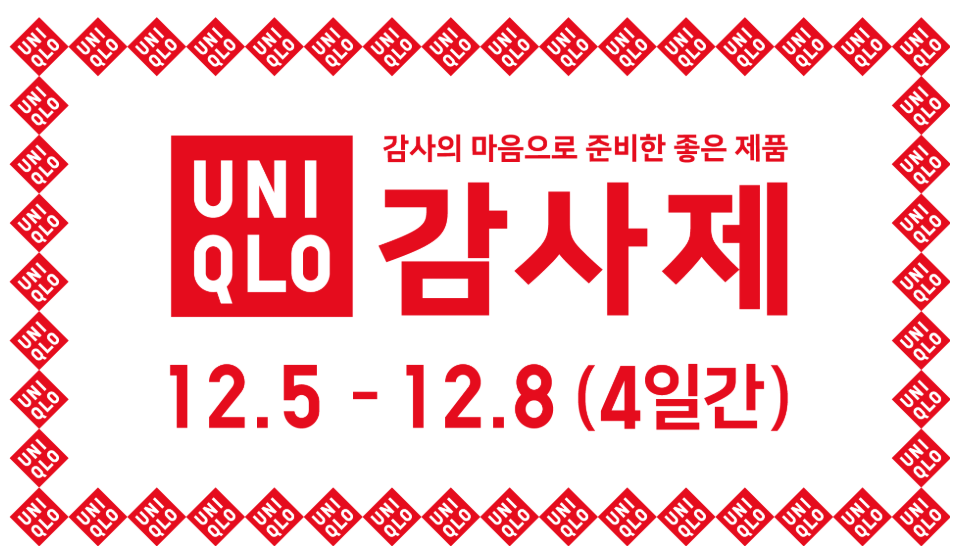 1년에 두 번. 상반기와 하반기에 진행하는 유니클로 감사제가 공개가 됐다. 보통 11월 말에 진행이 되는데 12월 초에 진행이 되는 건 처음 보는 것 같다. 일본에선 11월 말에 이미 진행이 됐고, 한국은 12월 5일(금)~8일(월)까지 짧게 진행된다.