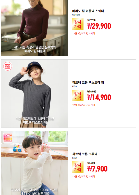 이외에도 상반기 감사제나 일본 감사제 상품을 생각하면 더 다양한 상품이 할인할 예정으로 보인다. 일본과 동일한 상품을 진행하지는 않지만 히트텍을 비롯한 C라인 스웨트팬츠, 퍼프테크 재킷, 캐시미어 니트, 수피마코튼 양말, 웜이지팬츠, 슬랙스, 숄더백 등등 다양한 상품을 세일을 진행했기에 비슷하게 하지 않을까 싶다.