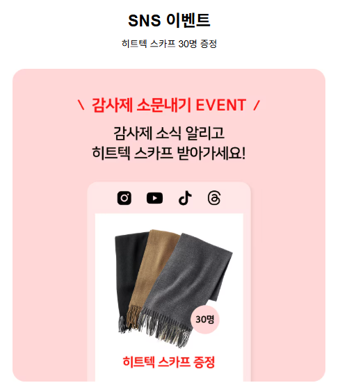 - 감사제 소식 인스타로 홍보하면 30명 추첨하여 히트텍 스카프 증정