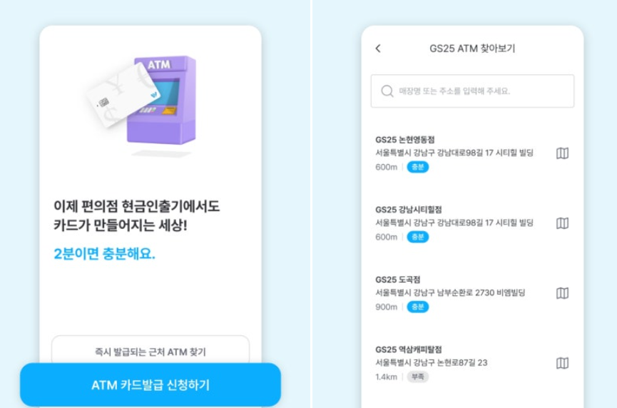 발급 방법은 굉장히 간단하다. 핸드폰에서 트래블월렛 앱을 다운받고 모바일 카드 신청을 하면 끝. 이제 여기서 실물 카드가 필요한데 택배로 받는 방법도 있지만 훨씬 빠르게 받을 수 있는 방법이 GS25 편의점에 있는 ATM 기기로 받는 방법이다.
