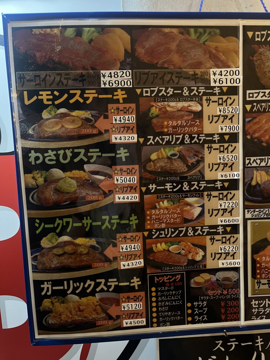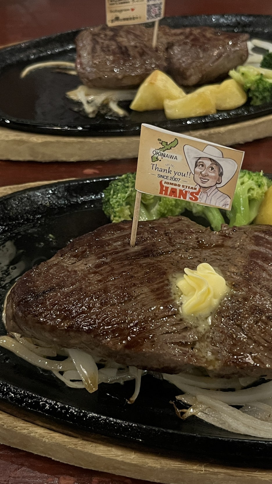 거의 6시 30분까지 채우고 나서 다시 숙소로 돌아오니 오후 8시쯤. 바로 앞이 아메리칸 빌리지니 구경을 좀 했다. 오키나와 가게들은 대부분 일찍 닫지만 아메빌과 일부 프랜차이즈는 늦게까지 열고 항상 스테이크집은 가장 늦게까지 하길래(거의 오후 10시~11시까지) 바로 앞에 한스 스테이크가 있어서 갔다.
