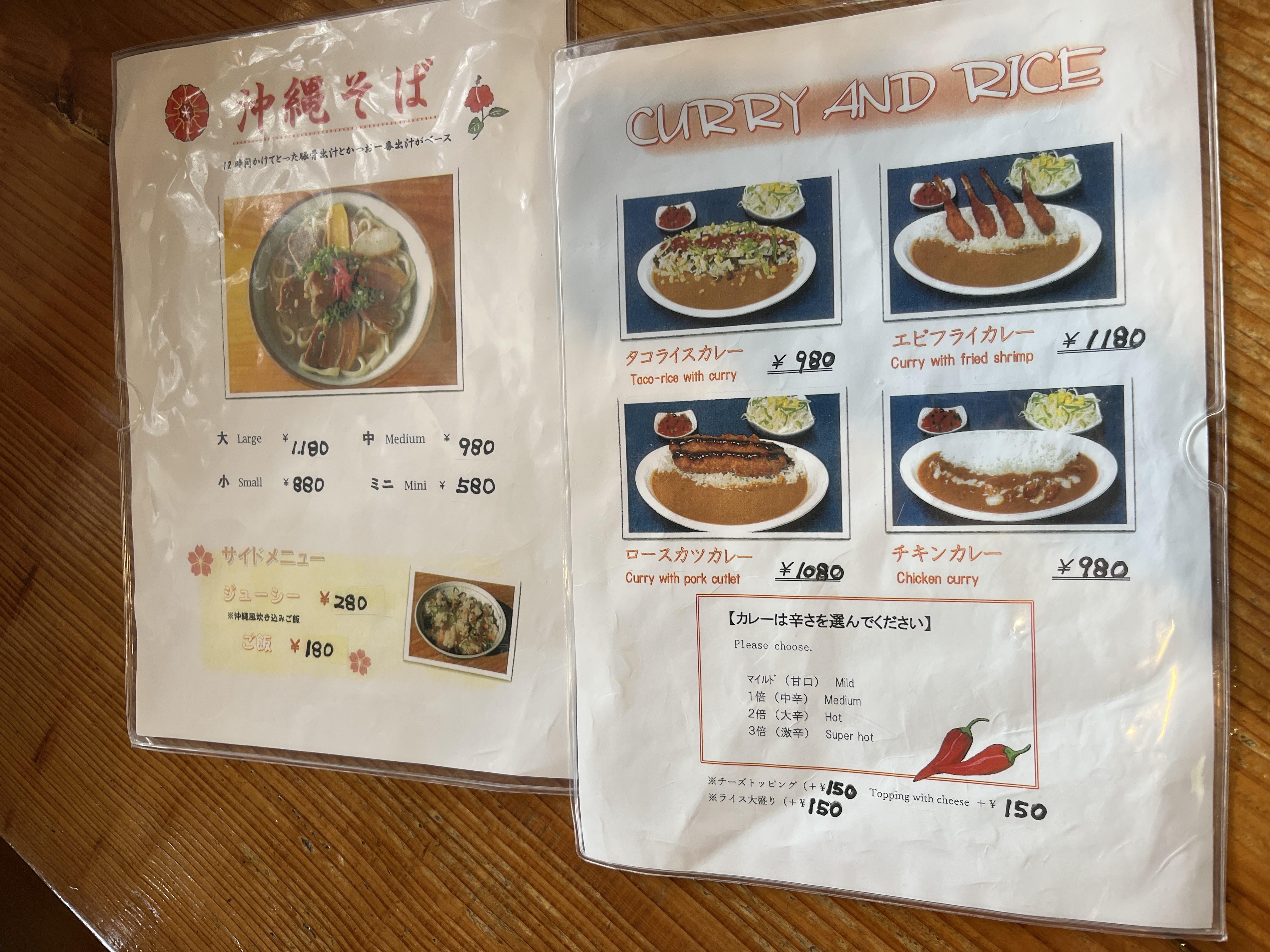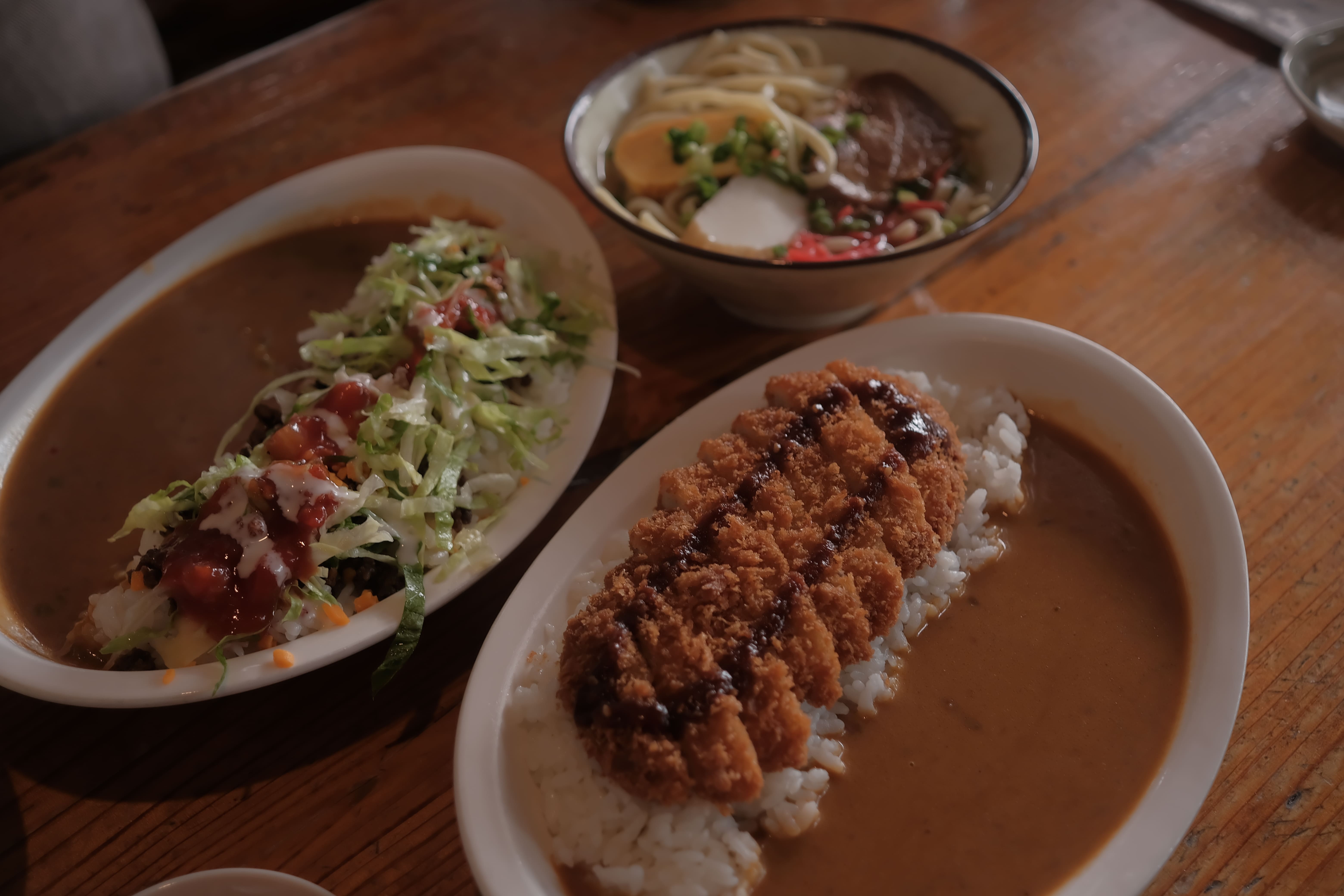 카레, 타코 라이스 오키나와 소바 등을 팔았고 포크커틀릿 카레, 타코 라이스 카레, 오키나와 소바(미니)로 시켰다. 현금 결제만 가능하고 앞에 주차는 4자리 정도만 가능했다. 타코 라이스는 내 스타일이 아니었고 정갈하고 맛있고 친절해서 기분이 좋았다.