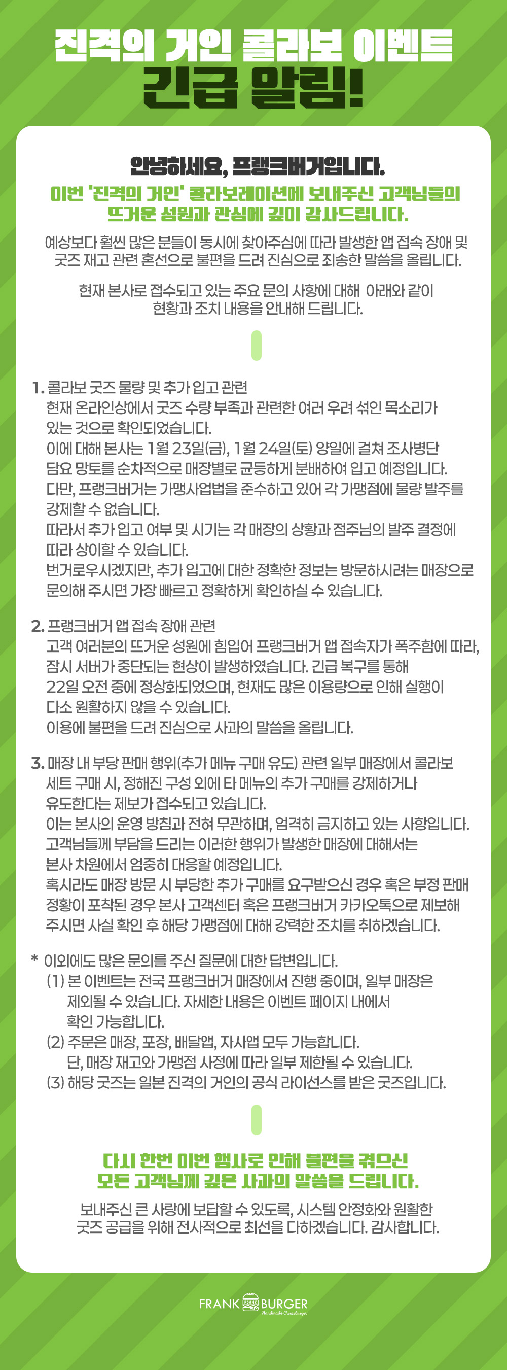📌이후 프랭크버거가 오후 6시쯤 공식 홈페이지를 통해 긴급공지를 올렸다. 이는 공식 인스타그램에서도 확인할 수 있는 내용이다.
