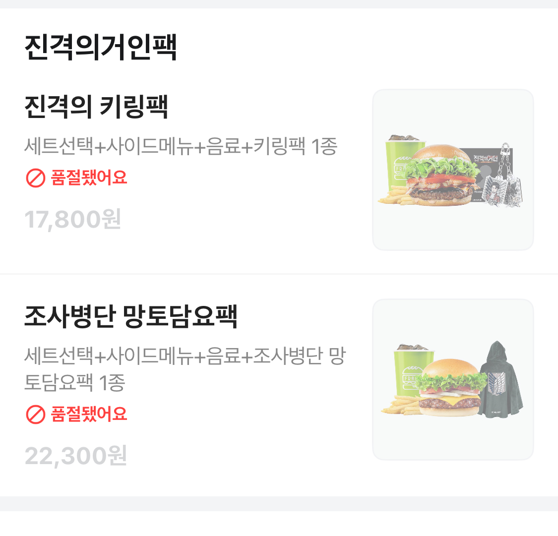 26년 1월 22일(목)부터 프랭크버거 진격의거인 콜라보로 조사병단 담요 세트와 키링 세트가 판매한다는 게시글이 올라왔고 홍보가 많이 됐다. 심지어 진격의거인 팬층은 넓고 두터워서 이미 수요가 많은 상황
