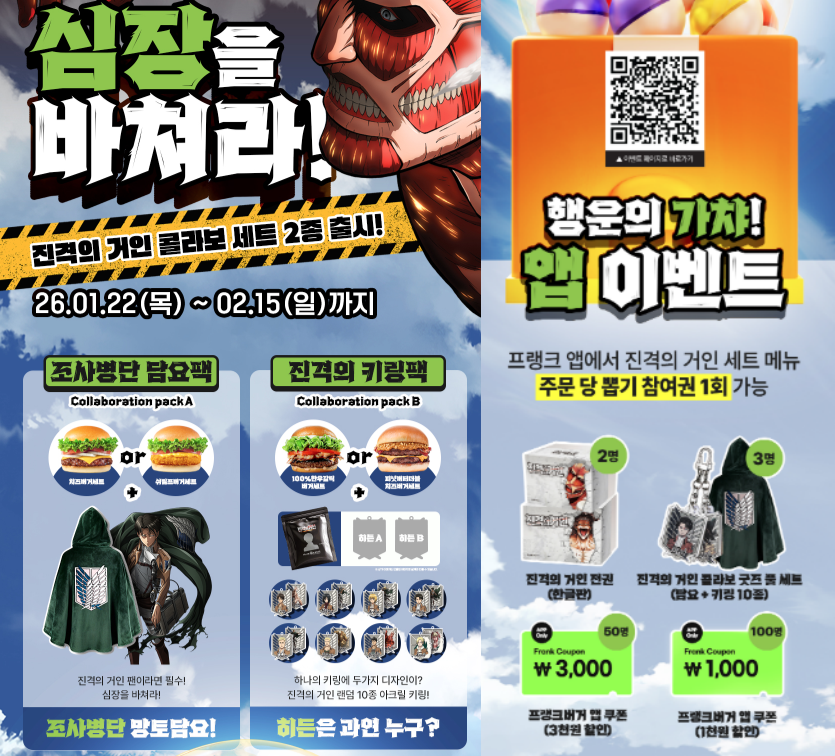 - 2명에겐 진격의거인 한글판 전권 및 버거 쿠폰 3천 원 할인, 3명에겐 진격의거인 콜라보 굿즈 풀세트(조사병단 담요+키링 10종)와 프랭크 버거 1천 원 할인 쿠폰 제공