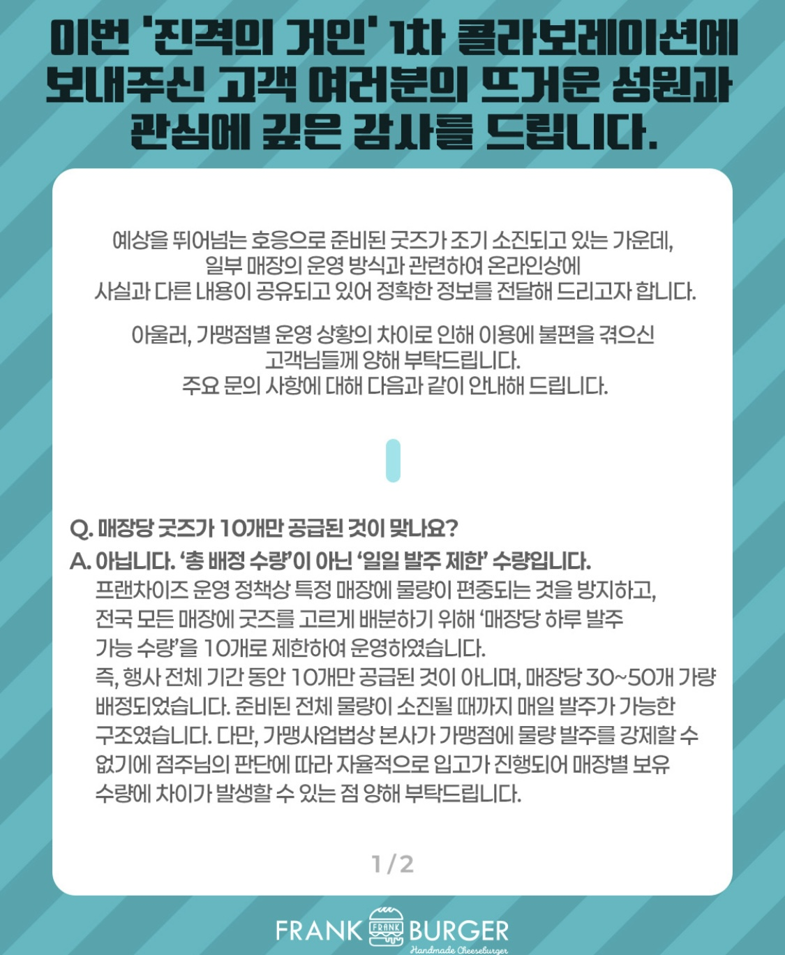 1) 매장당 굿즈 10개가 아니라 1일 발주 물량이 1박스(10개)였고 매장당 총 30~50개가 배정. 본사가 가맹점에 물량 발주를 강제할 수 없어 자율적으로 입고기 진행이 됐다. **프랭크버거 점장님들의 말 : 수강신청을 하듯이 오전 10시에 똑같이 발주를 선착순으로 했고 거기서 소진되면 끝.