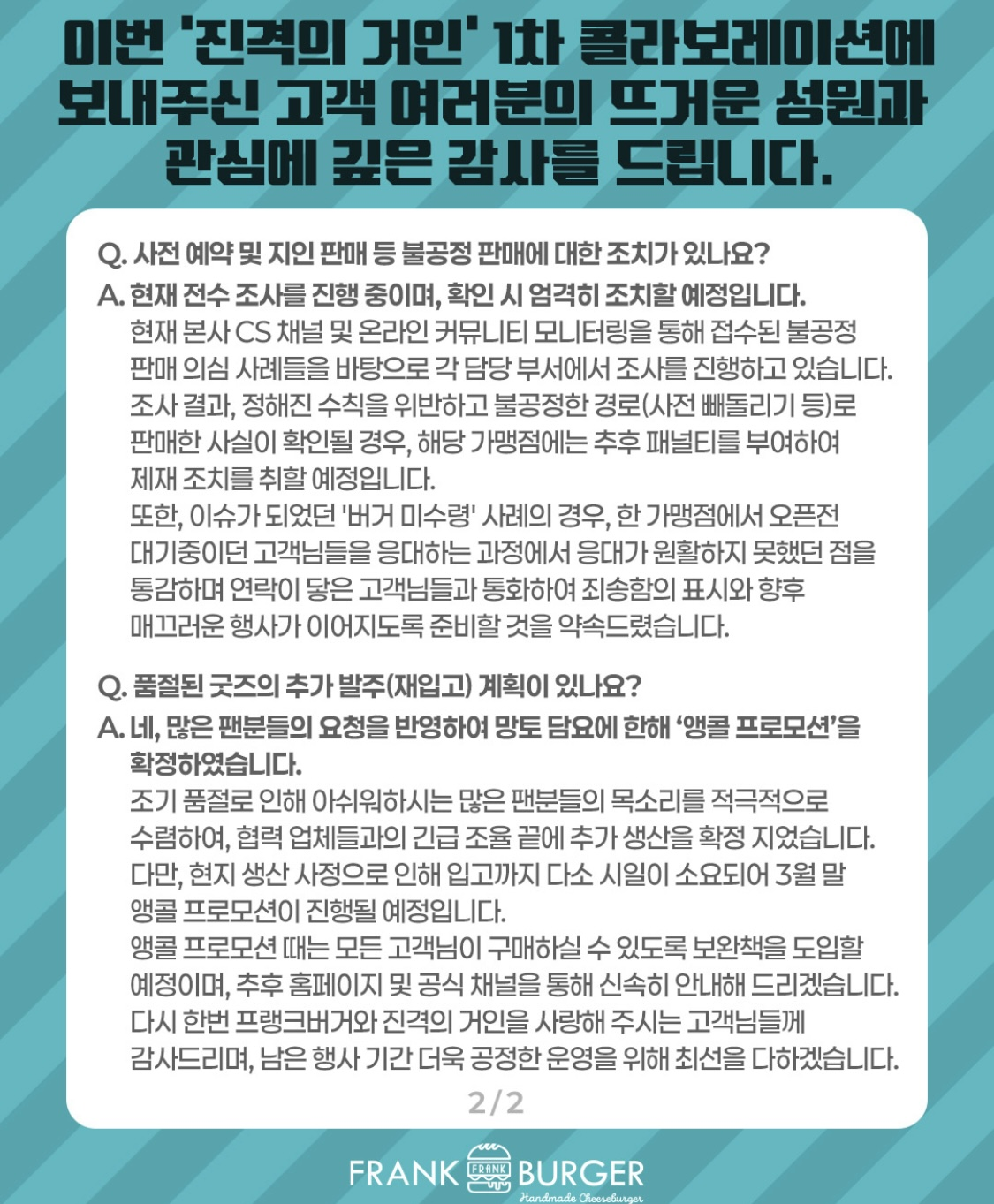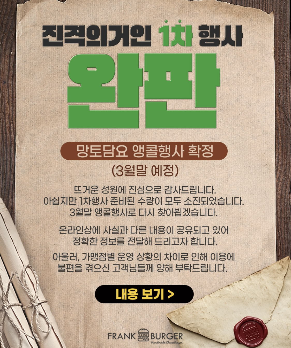26.01.22.부터 2월 15일까지 진행이 됐던 진격의 거인 콜라보세트. 굿즈의 퀄이 좋아서 다들 기대를 많이 했지만 기대가 높았던 만큼 이미 다들 알다시피 이번 행사는 프랭크버거의 이미지를 깎아내린 마케팅이 돼버렸다.