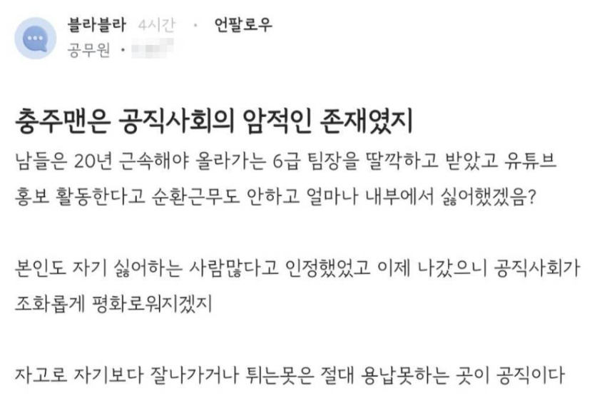 블라인드나 충주맨이 방송에서 충주맨은 공직 사회의 암적인 존재였다라거나 파격적 인사에 항의를 하기도 하고 대놓고 나도 유튜버나 할 걸 그랬다는 말들이 많았다고 함