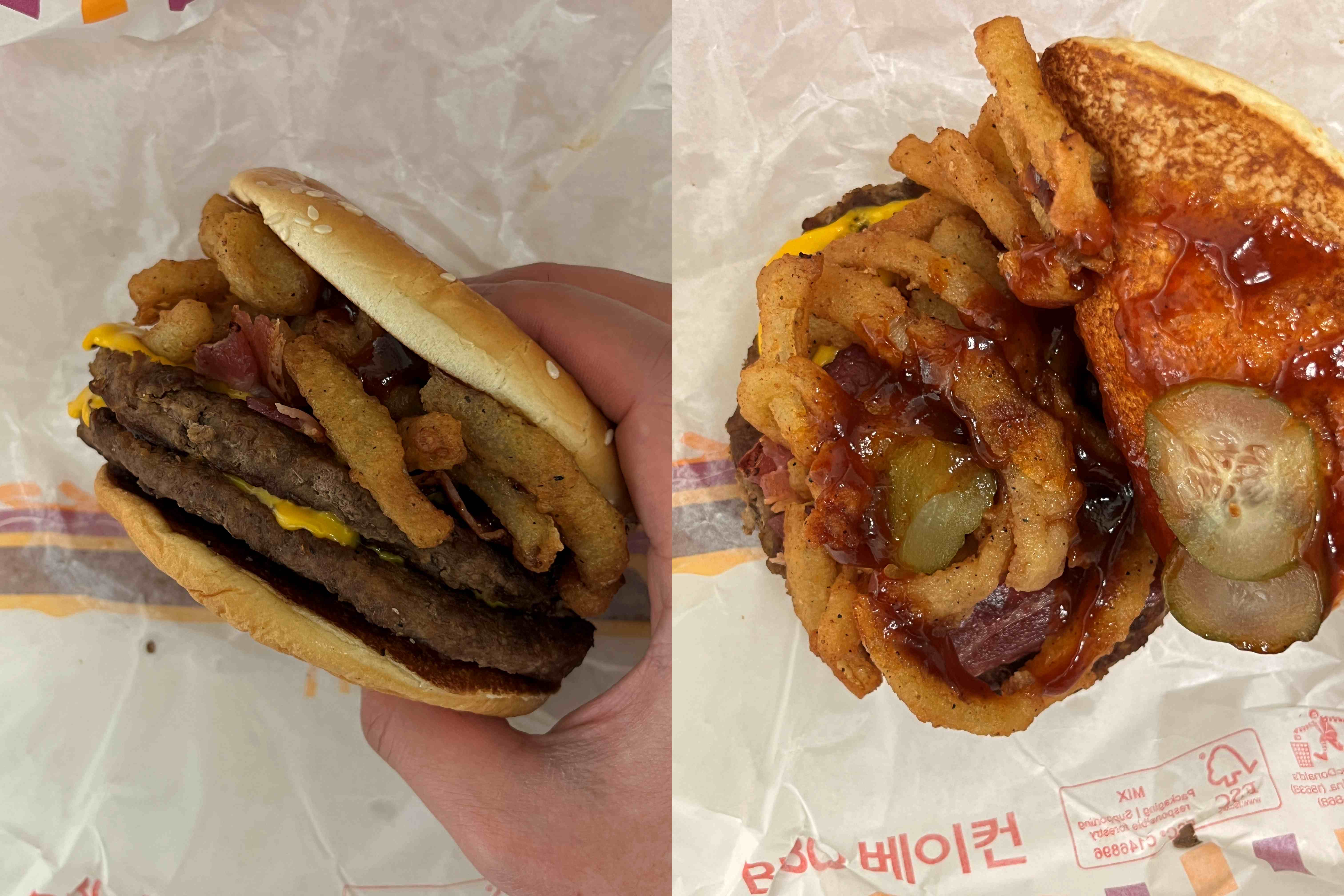 가뜩이나 두툼한데 패티가 두 장이나 들어가고 위에는 생양파 대신 양파를 튀긴 어니언링이 있고 추가로 베이컨이 있다. 그 외는 빵이나 치즈, 피클 구성이 동일하다. 굉장히 두툼해서 배부르고 맛있다.