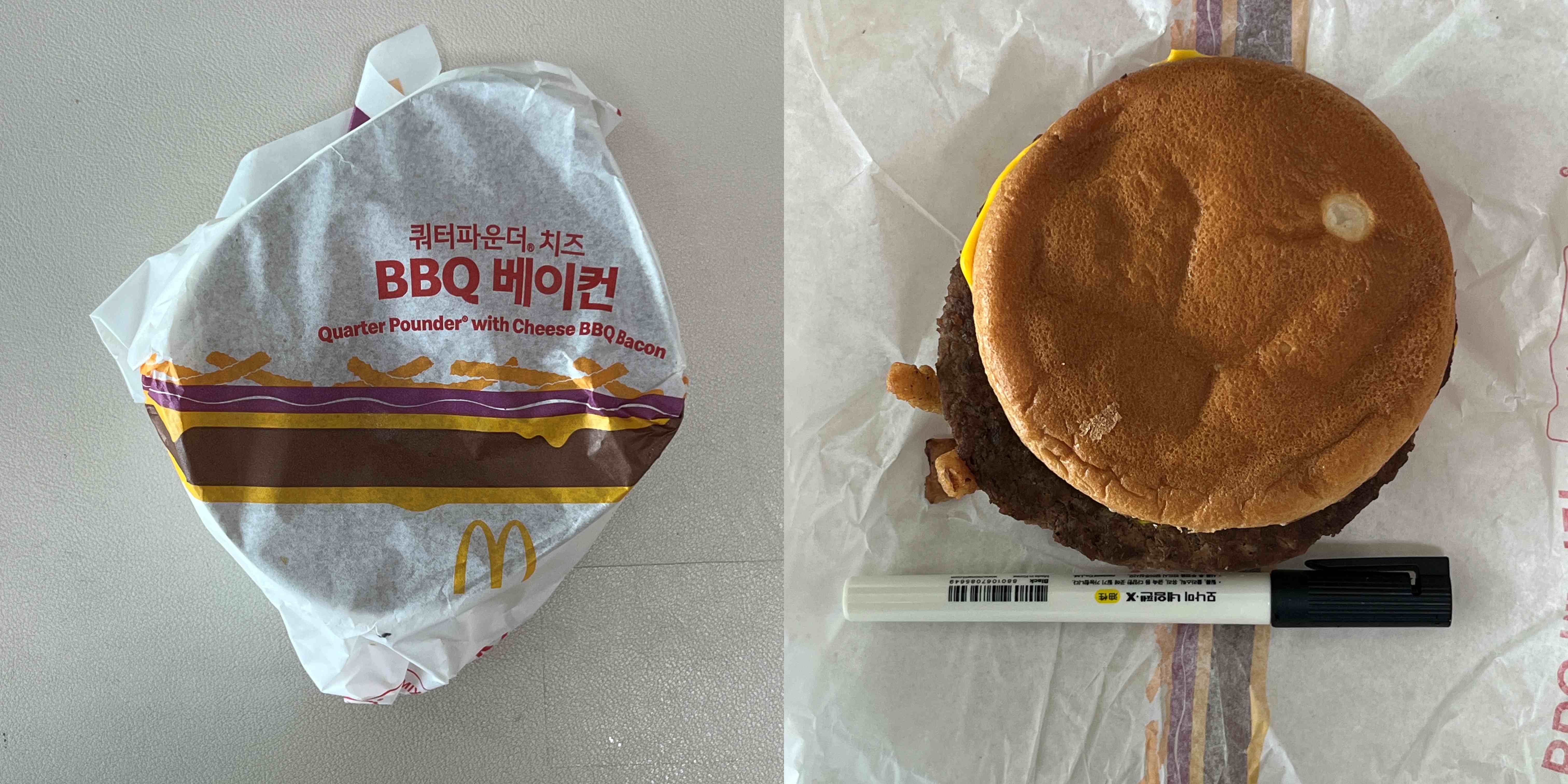나는 더블 쿼터파운더 치즈 BBQ 베이컨 버거를 먹었고 지름은 그냥 쿼터파운더 치즈 및 더블 쿼터파운더 치즈 버거와 동일하다.