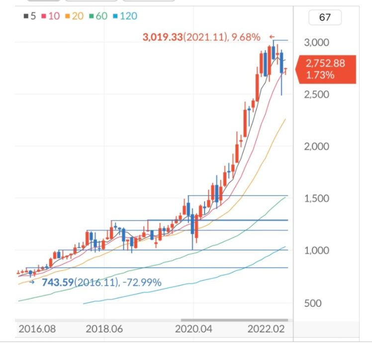 아래는 구글의 모회사인 알파벳A(구글)의 주가 차트. 곡선이 아주 어마어마하다.