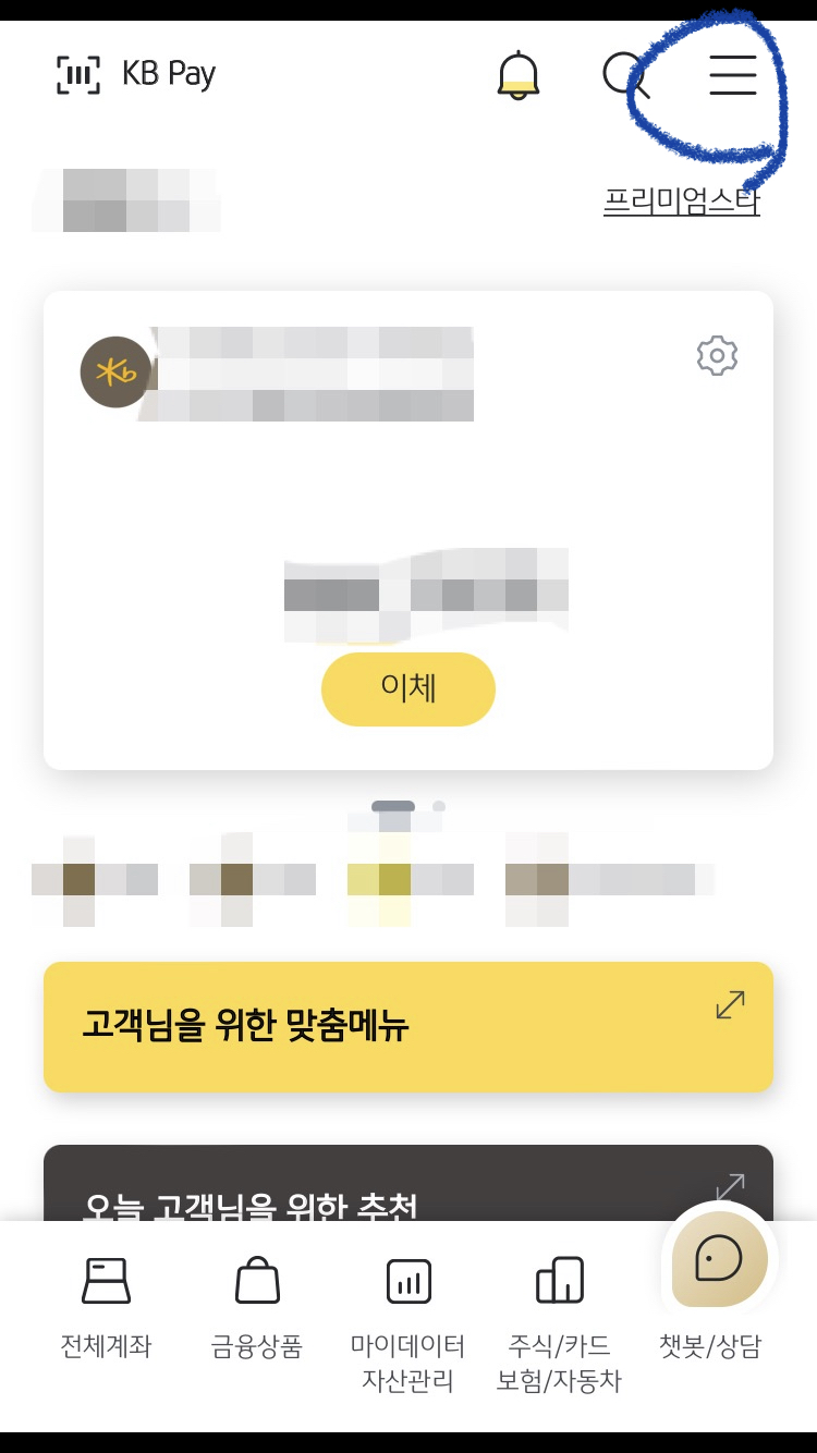 1. 국민은행 모바일앱에 들어간다. 팝업창으로 뜨는 경우도 있는데 못 봤다면 오른쪽 상단에 줄 3개로 된 걸 클릭한다.