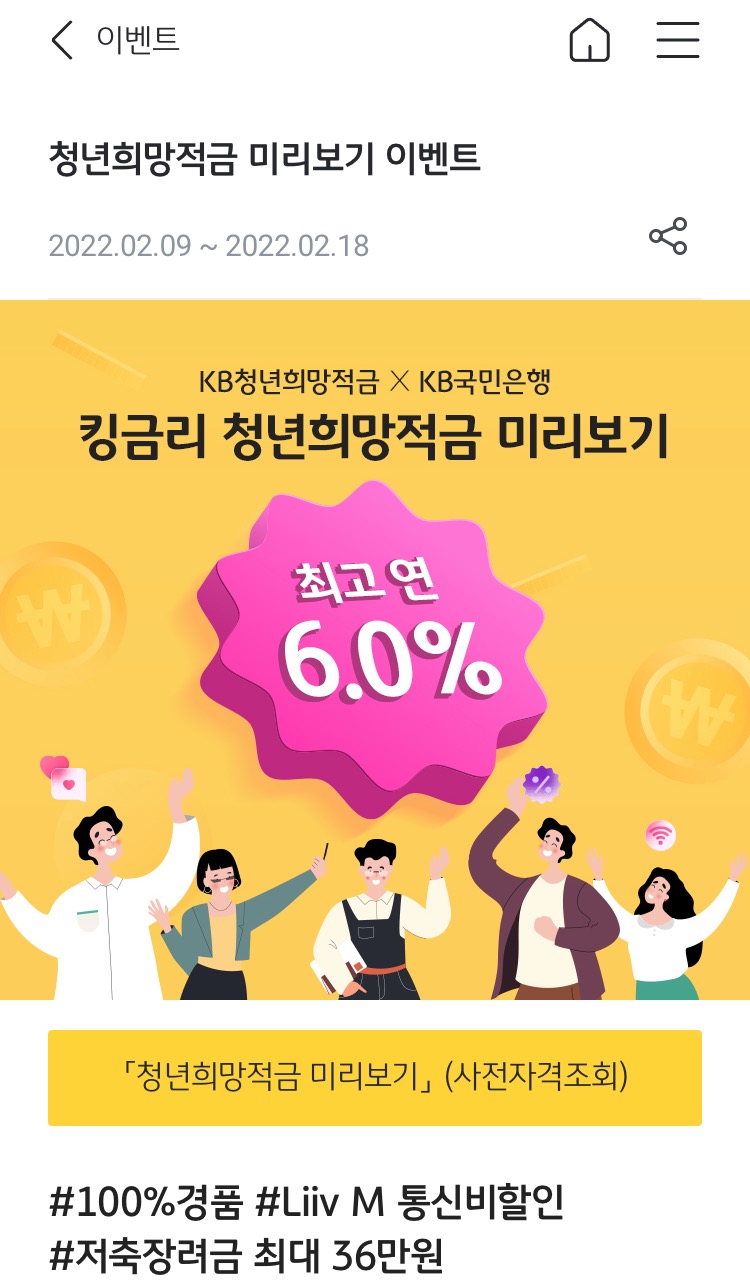 첫째, 청년희망적금 국민은행 미리보기로 가입가능여부를 확인하는 법은 하단과 같다.