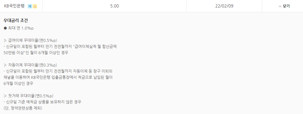 여기에 국민은행의 경우 우대금리가 연 1%까지 받을 수 있는데 우대금리를 만족하면 시중은행 이자는 6%를 받게 된다.