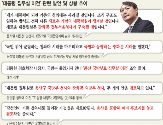 다만, 윤석열 당선인은 취임 전에 새 집무실로 출근하고 싶은 의지를 보이고 있다. 이렇게 되면 대통령실이 있는 공간을 2개월도 안 되는 채로 모든 사전 조사와 답사를 마치고 옮겨야 한다. 그리고 당선 이후 현재 국방부 부지 이전 계획을 담은 보고서가 일주일 만에 만들어진 것이고 이건 문제가 있다고 본다.