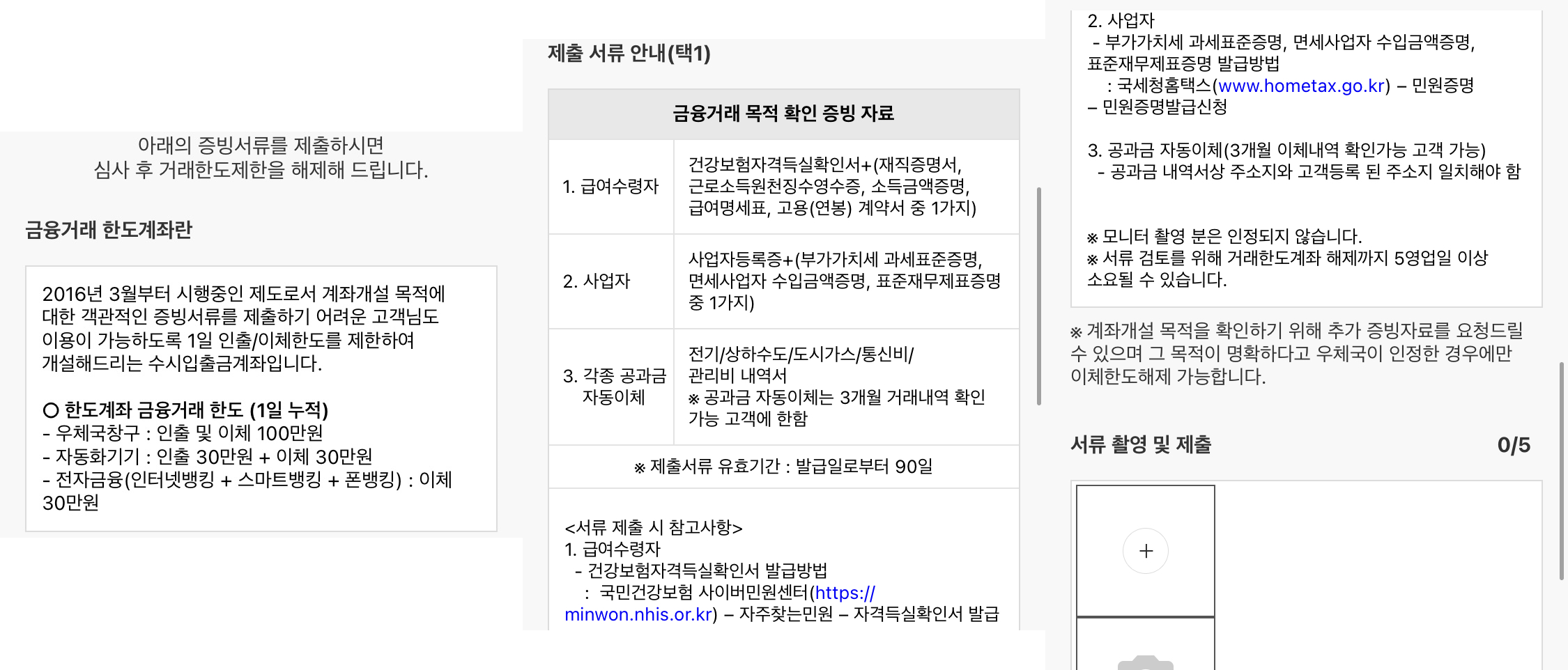 어플로 이체한도를 해제하려고 하니까 아래 증빙서류를 제출하고 심사 후 해제를 시켜준다고 한다. 그런데 검색을 해보니, 건강보험자격득실확인서 및 재직증명서를 첨부하여 보내도 급여통장으로 사용하지 않으면 한도 해제가 안된다고 한 글을 보았다. 나는 급여통장이 KB라 당연히 안된다. 대신 우체국에 직접 가서 직원분께 설명을 하고 임시한도제한을 해제하면 된다고 하였다.