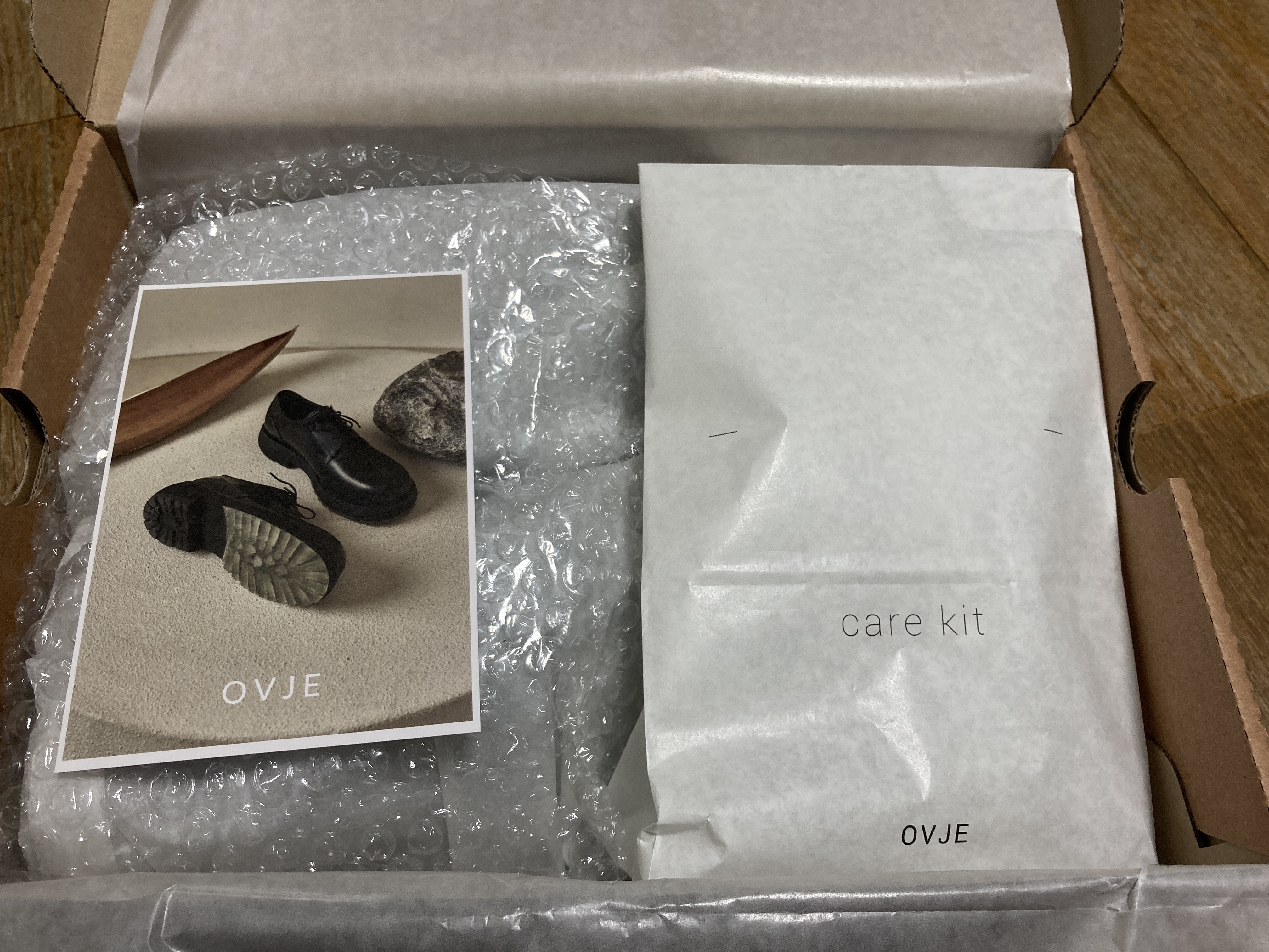 패키징은 깔끔하다. 슈케어 키트와 왼쪽에 엽서 같은 게 있는데, 뒤집으면 제품 안내와 품질 보증서 및 내 이름과 주문 날짜 사이즈가 기재돼있다.