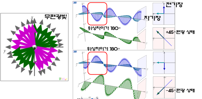 뭔소리냐하면 사진을 보면 위는 파란색 전기장이 마이너스지만, 아래는 플러스다. 파동의 축 성분이 반대가 되는걸 위상차이라고 한다. 두 개의 파동은 반대 상태의 편광을 나타난다. 즉, 특정 축 성분의 전기장을 제거. 한 마디로 전기장에 약간 손을 대주면 빛이 한 방향으로만 진동하게 된다는 것이다.