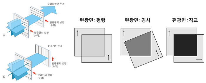 이를 이용해 무편광상태를 편광 상태로 바꿔주는 게 편광판이다. 편광판을 통과하면 무평관상태도 편광 상태가 된다. 수평 편광판을 지나가면 수평 편광으로, 수직 편광판을 지나면 수직 편광으로 간다. 이때 수 평평관은 수직 편광과 방향이 다르기 때문에 통과하지 못하며, 빛을 차단해 검은색으로 보이게 할 수 있다.