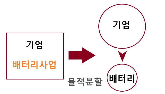 화두인 LG화학을 예로 든다면, LG화학은 석유화학, 소재, 배터리 사업부 등이 있다. 배터리 사업부를 물적분할하게 된다면 LG화학이 모기업이 되고, 분할된 가칭 LG에너지솔루션은 LG화학의 자회사가 된다.