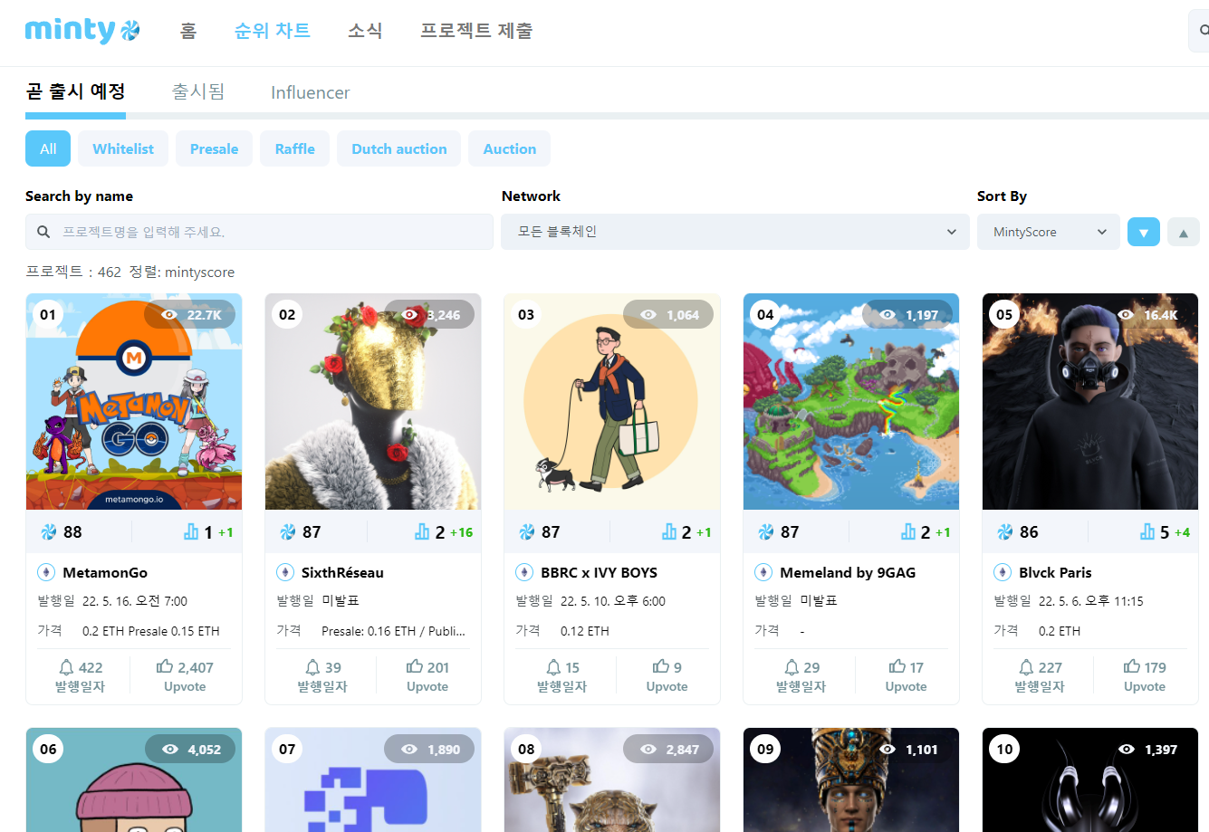 - MintyScore를 이용한다. 이곳은 한국어로 된 사이트는 아니지만, 부분적으로 한국어를 지원하며 프로젝트별 디스코드나 트위터 링크도 제공하고 있다. 프로젝트마다의 자료를 좀 살펴보기가 수월하다는 것