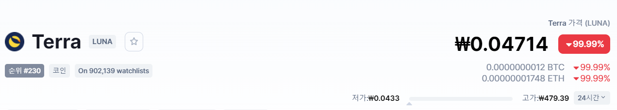 개당 테라 코인은 현재 1달러도 안 되는 0.04714달러. 약 4 센트 하고 있다.
