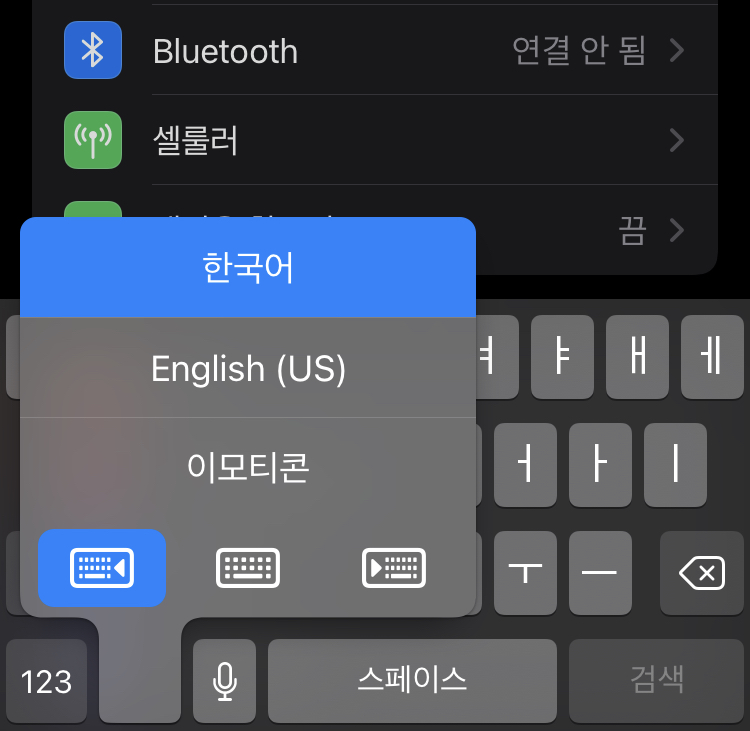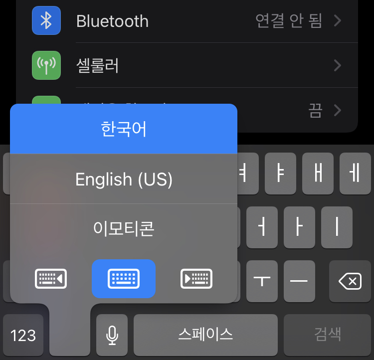 - 아이폰 키보드에서 하단에 지구본 모양과 같은 걸 꾸욱 눌러준다. 그러면 하단 이미지처럼 한국어, 영어, 이모티콘과 함께 아래에 키보드 모양이 보일 거다,
