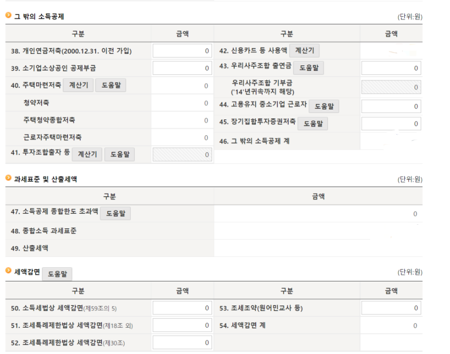 이렇게 많은 명목들을 확인하고 계산을 눌러주고 나면 맨 아래에 드디어 가장 중요한 세액공제 합계가 나온다. 환급을 받을 것인지, 세금을 토해낼 것인지..!!