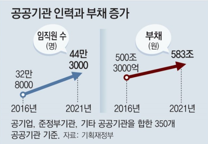 이전 문정부 때 일자리 정책 중 하나로 공기업과 공무원의 채용을 늘렸다. 그중 공공기관을 기준으로 임직원 수는 2016년 32만 8천 명에서 2021년 44만 3천 명으로 늘었다. 부채는 16년 500조 3천 억에서 21년 583조로 늘었다.