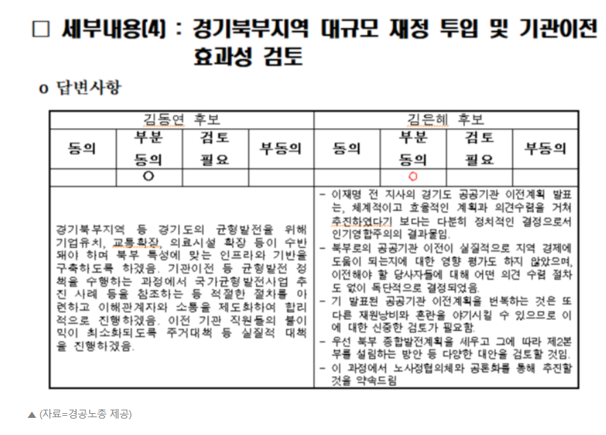 가장 큰 이슈 중 하나였던 경기도 공공기관 동·북부 이전에 대해 입장차를 보이고 있으나, 공통적으로 동의하는 것은 ‘공공기관 노사정협의회 설치’이며, 후보들의 입장은 하단과 같다.