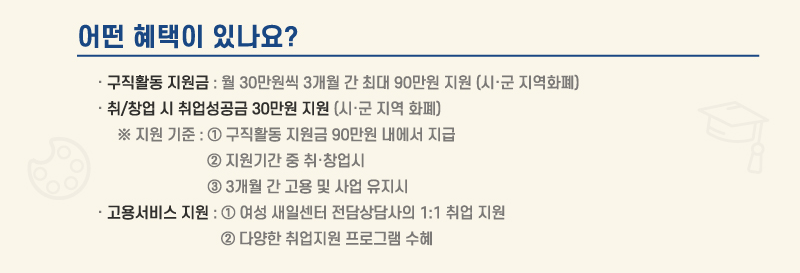 - 구직활동 지원금 월 30만 원씩 최대 3개월까지 지역화폐 지급 *총 90만 원까지 지원
