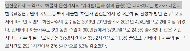 - 그래서 최저운송료 보장인 '안전운임제'를 정부가 개입해 2020년 시행했다. 최저 운송료를 정하고, 이를 어기는 사람에게는 과태료를 부과한다.