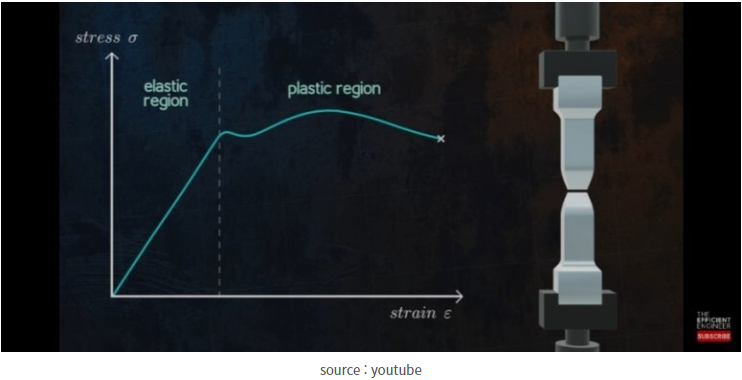 ▲ 탄성 영역을 지나 물체가 변하는 소성 영역으로 넘어간다고 했다. 이때 원래 상태로 돌아갈 수 있는, 즉, 탄성 영역에서의 최대 힘을 '항복 강도(Yield strength)'라고 부른다.