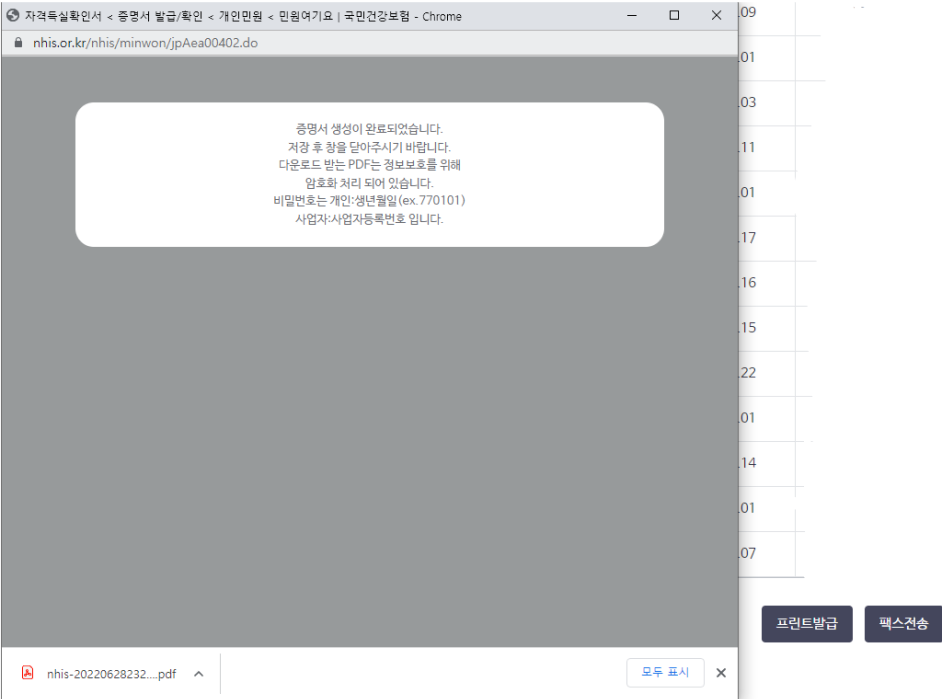 5. 그러면 하단에 쭈욱 조회가 될 것이고, 밑으로 쭉 내리면 '프린트발급' 버튼이 있다. 이걸 클릭하면 하단과 같은 팝업이 뜨면서 PDF 파일이 자동으로 저장이 된다.