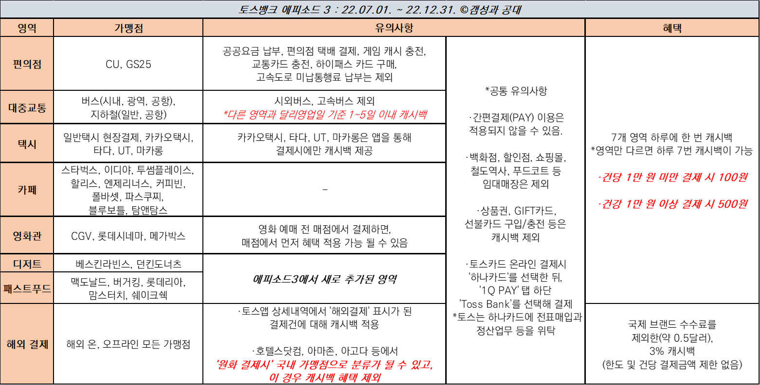 토스뱅크는 출범 이후 약 6개월가량씩 시즌을 바꾸며, 캐시백 혜택을 강화하거나, 조건을 바꾸며 쭉 고객 유치를 하고 있는 중이다. 22.06월까지였던 에피소드2가 끝나고, 7월부터는 에피소드3 혜택이 적용된다.