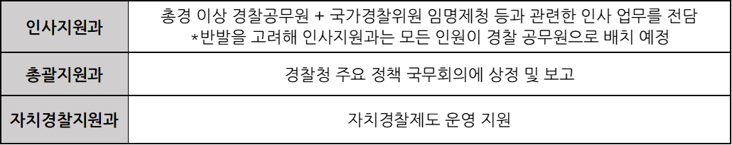 행안부는 업무 수요가 증가할 경우 경찰로부터 인력 2~3명을 파견받아 경찰국을 운영하겠다고 밝힘. 인력을 파견받는 경우엔 경찰국 부서 내 약 80%가 경찰 공무원이 될 것으로 예상