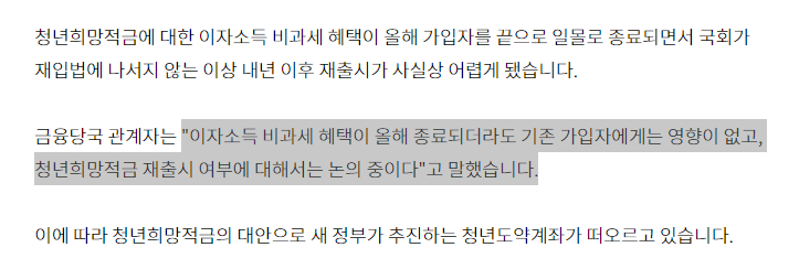 *또한, 기존 청년희망적금에 이자소득 비과세 혜택 종료는 22년 9월 발표 예정인 윤석열 대통령의 공약이었던 '청년도약계좌(=청년장기자산계좌)' 시행을 위한 세금 혜택 감면으로 보임.