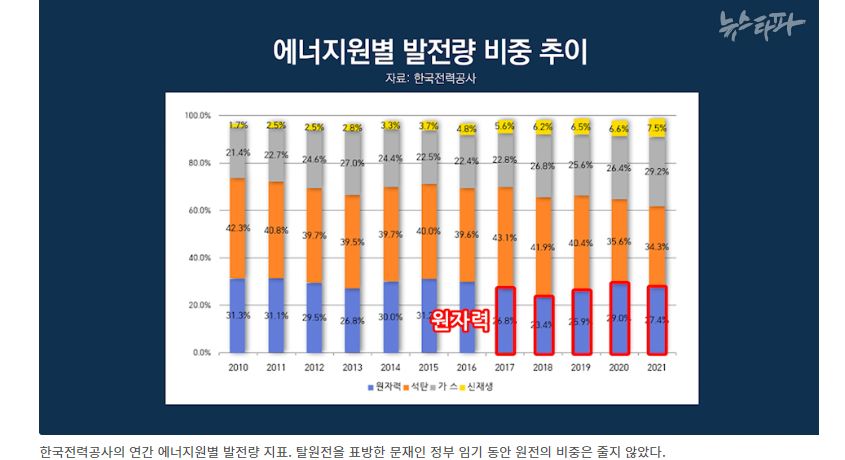 이전 정권이 탈원정 정책을 추진했던 것 맞는데, 원전 가동률이 낮아지지도, 에너지 비중이 감소하지도 않았다.