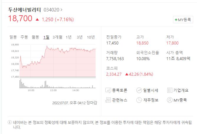 윤 정부의 친원전 정책 선언에 이어, 유럽에서 국내 최초로 원전안전 표준 인증을 취득한 '두산에너지빌리(두산중공업)'은 덕분에 금일 7% 이상 주가가 뛰었다.
