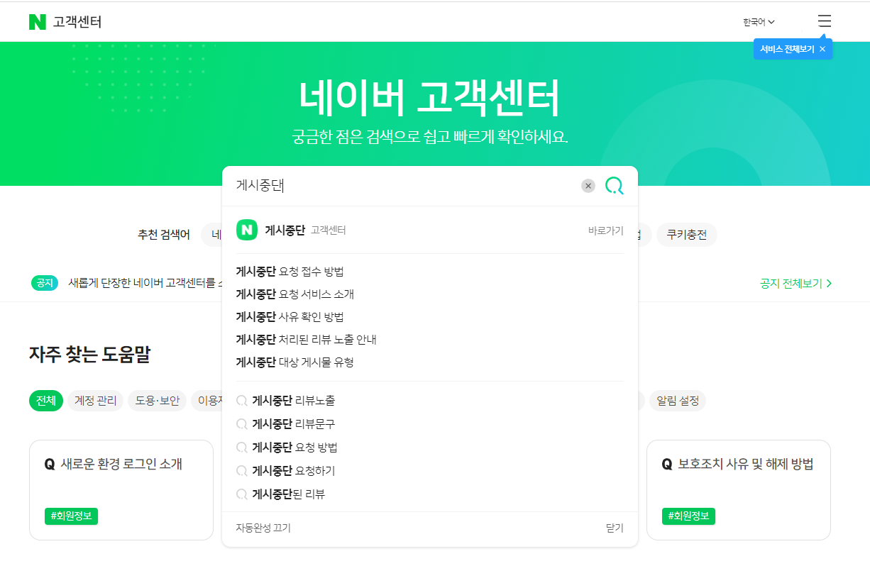 1) 네이버 고객센터 검색 후 고객센터에 들어간다. 그리고 검색창에 게시중단을 검색하면 바로가기가 뜨는데, '게시중단 고객센터'로 들어가면 된다.