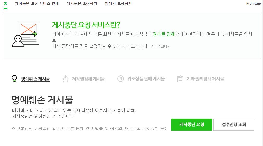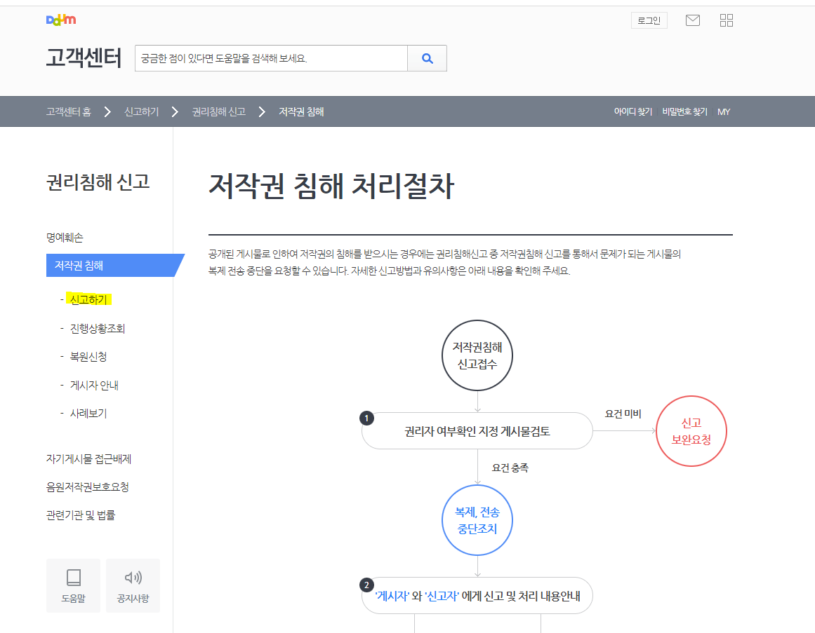 2) 들어가면 알맞은 서비스를 클릭 후 '게시중단 요청'을 눌러 절차에 맞게 소명 및 자료를 첨부하여 신고를 한다. 저작권에 관련된 사항이기에 소명 자료를 넣어 자신의 것이라는 걸 증명해야 하고, 허위일 시 불이익을 받을 수 있으니 올바른 신고를 하자.