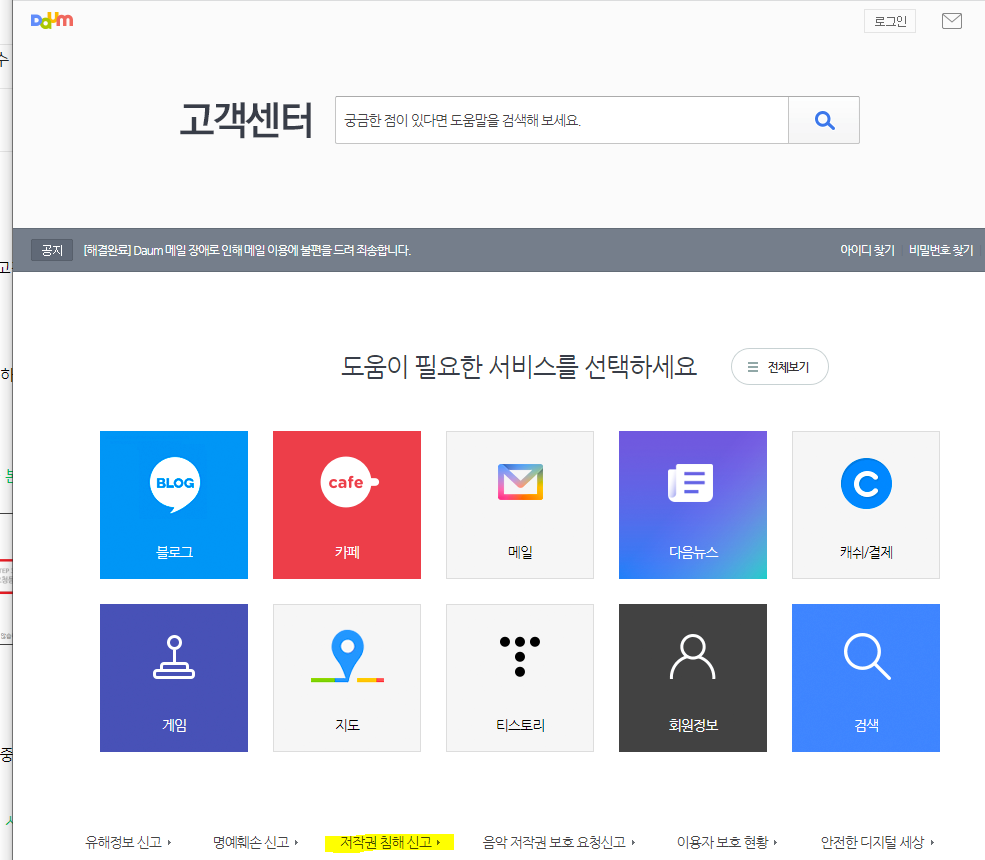 네이버에 접수 후 다음에도 같은 문제로 고객센터의 접수 및 처리를 하기로 했다. 다음은 비교적 간단하다.