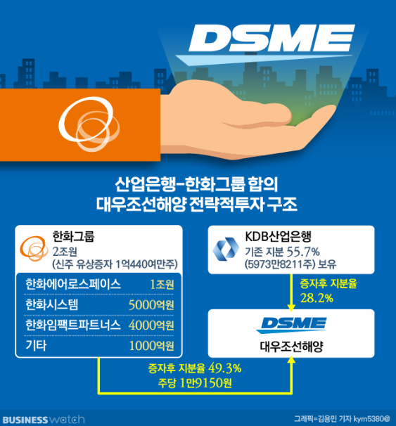 - 산업은행이 대우조선해양 주식을 2조 원에 매각하고 경영권을 넘기겠다고 하자, 한화가 인수에 나섰다. 다만, 산업은행은 더 비싸게 사겠다는 기업이 나오면 거기에 넘길 수도 있다고 했다.